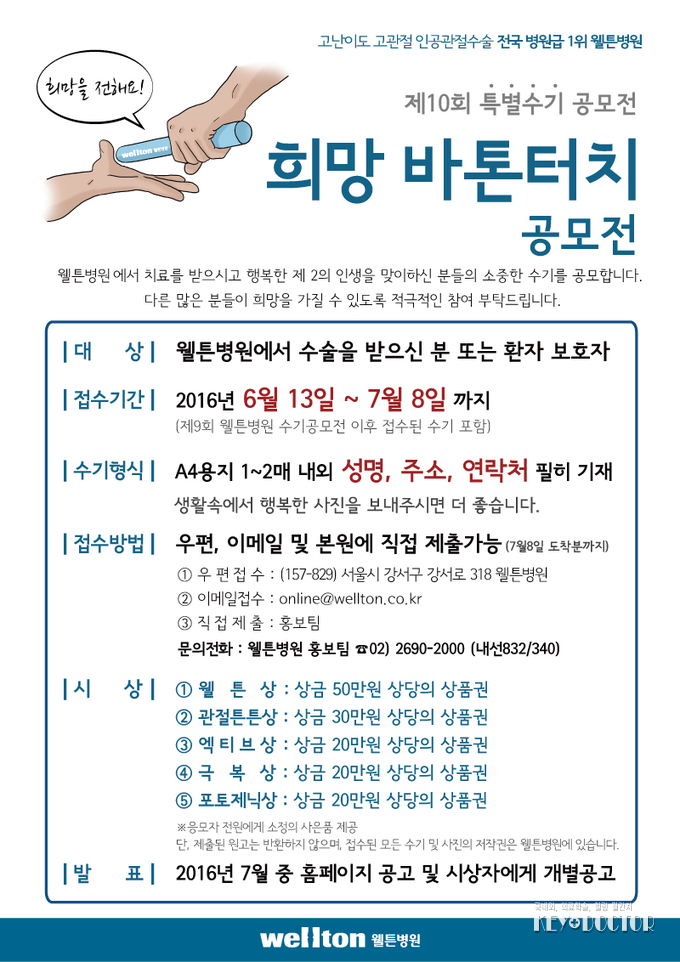 웰튼병원은 실제 수술 환자들의 사례를 통해 현재 관절 질환을 앓고 있는 환자들에게 희망의 메시지를 전하기 위한 취지로 환자 수기 공모를 실시, 10회째를 맞아 ‘희망 바톤터치’ 특별수기 공모전으로 진행된다.