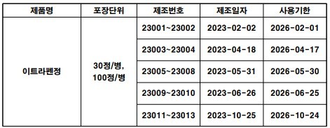 가 : 제품명 . : 이트라펜정 나 : 제조일자 사용기한 하단 기재 다: 제조번호 . : 하단 기재 라 ; 회수사유 . : NDMA 원료 중 등 불순물 함유 우려에 따른 사전예방적 조치로 시중 유통품에 대해 영업자 회수 마 : 회수방법 . : ,거래처 공문 발송 및 취급 판매업소 및 의료기관별 방문 택배를 통해 수거 및 반품 바 : 회수의무자 . : (주) 화이트생명과학 양원철 사 : 회수의무자 . : 4 89 소재지 경기도 화성시 만세구 향남읍 제약공단 길 아. : TEL)031-359-9500 FAX)031-359-9200 연락처 자. : 2026.03.31 자료작성연월일 * 당해 회수대상 의약품을 보관하고 있는 판매업소 및 약국이나 의료기관 등에서는 즉시 판매를 중지하고 회수의무자에게 반품하여 주시기 바랍니다