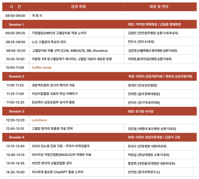 행사는 오전 9시 개회식을 시작으로 Session 1부터 Session 4까지 총 12개의 강연이 진행된다. ▲Session 1에서는 가정혈압(HBP) 적용법, 고령 고혈압 환자 관리, 항고혈압제 선택, 저용량 3제 요법 등 최신 치료 전략이 제시된다. ▲Session 2에서는 경동맥·심장초음파 해석과 이상지질혈증 진료 핵심 내용을 다룬다. ▲Session 3는 고혈압 환자 맞춤형 치료 전략에 집중하며, ▲Session 4에서는 2025 당뇨병 진료지침 변화, 대사이상 지방간질환 치료, 비만 환자 심혈관질환 관리, 의료진을 위한 ChatGPT 활용법 등 융합적 의제가 포함된다. 사전등록 방법 및 자세한 프로그램 안내는 학회 홈페이지(clinicalhypertension.kr)에서 확인할 수 있다.